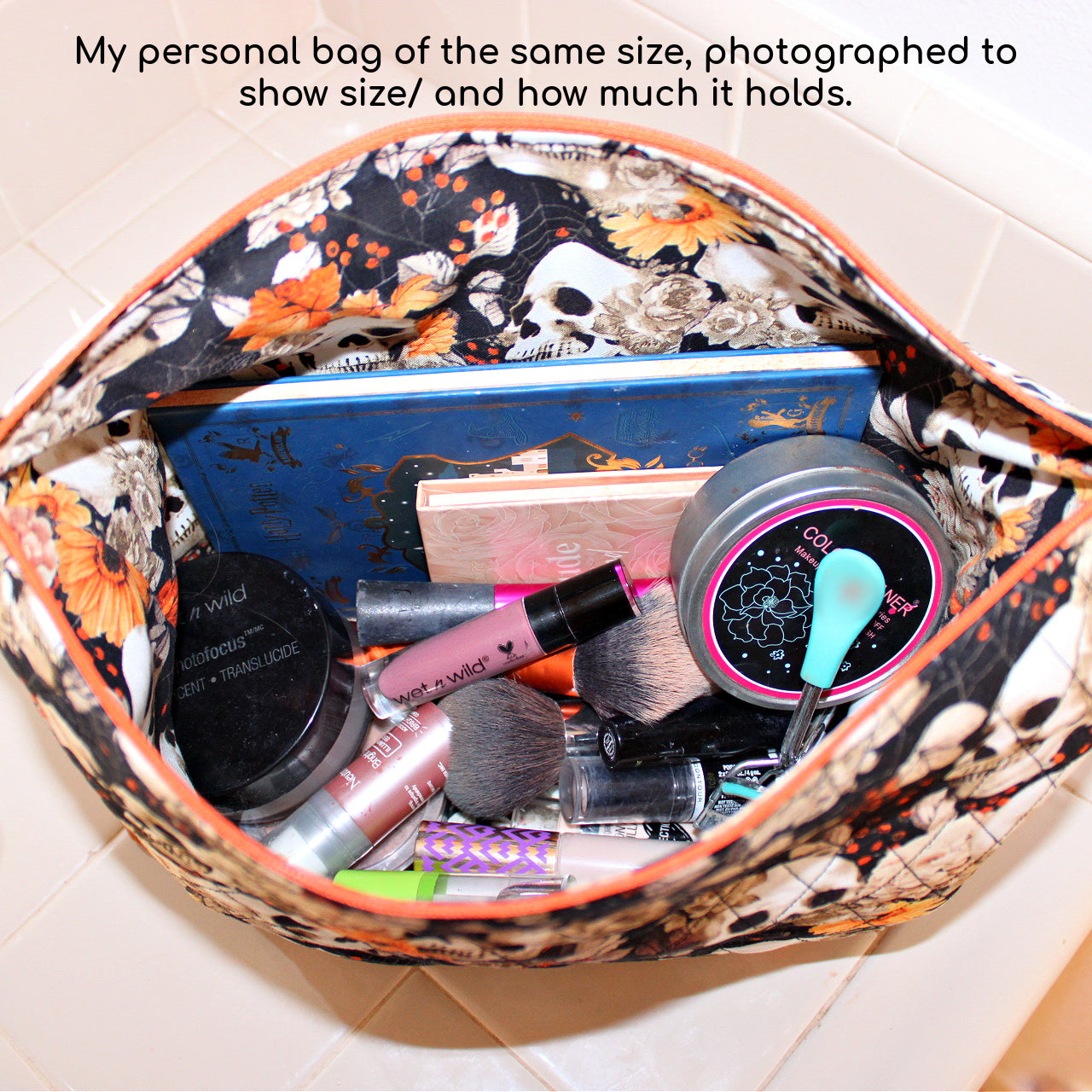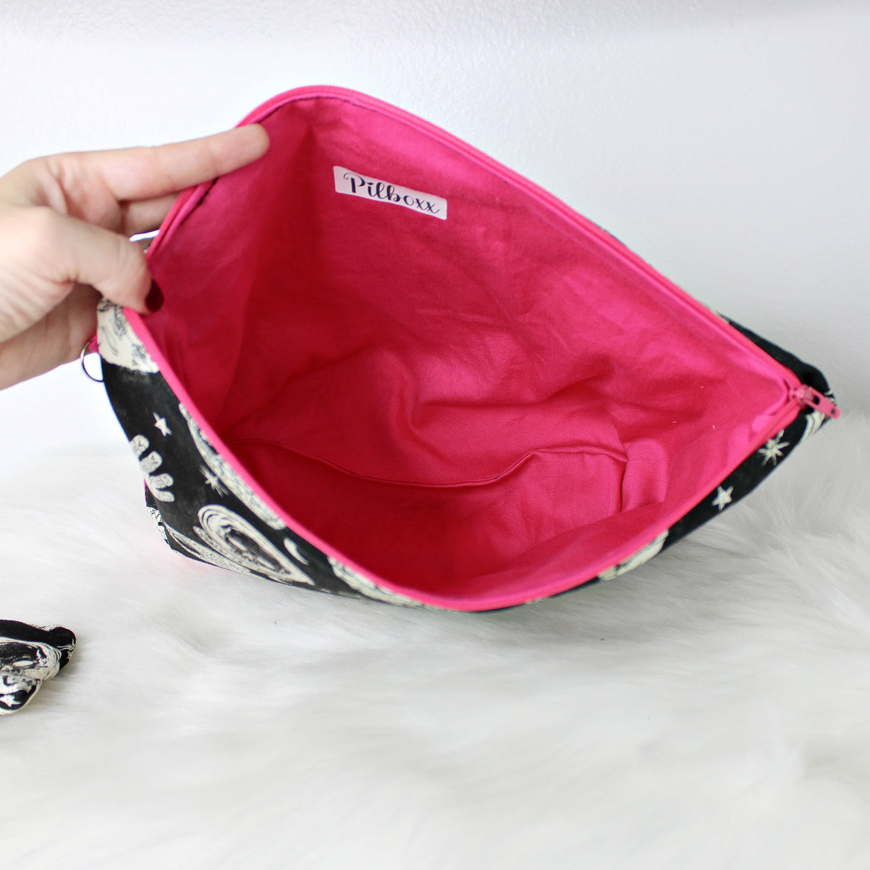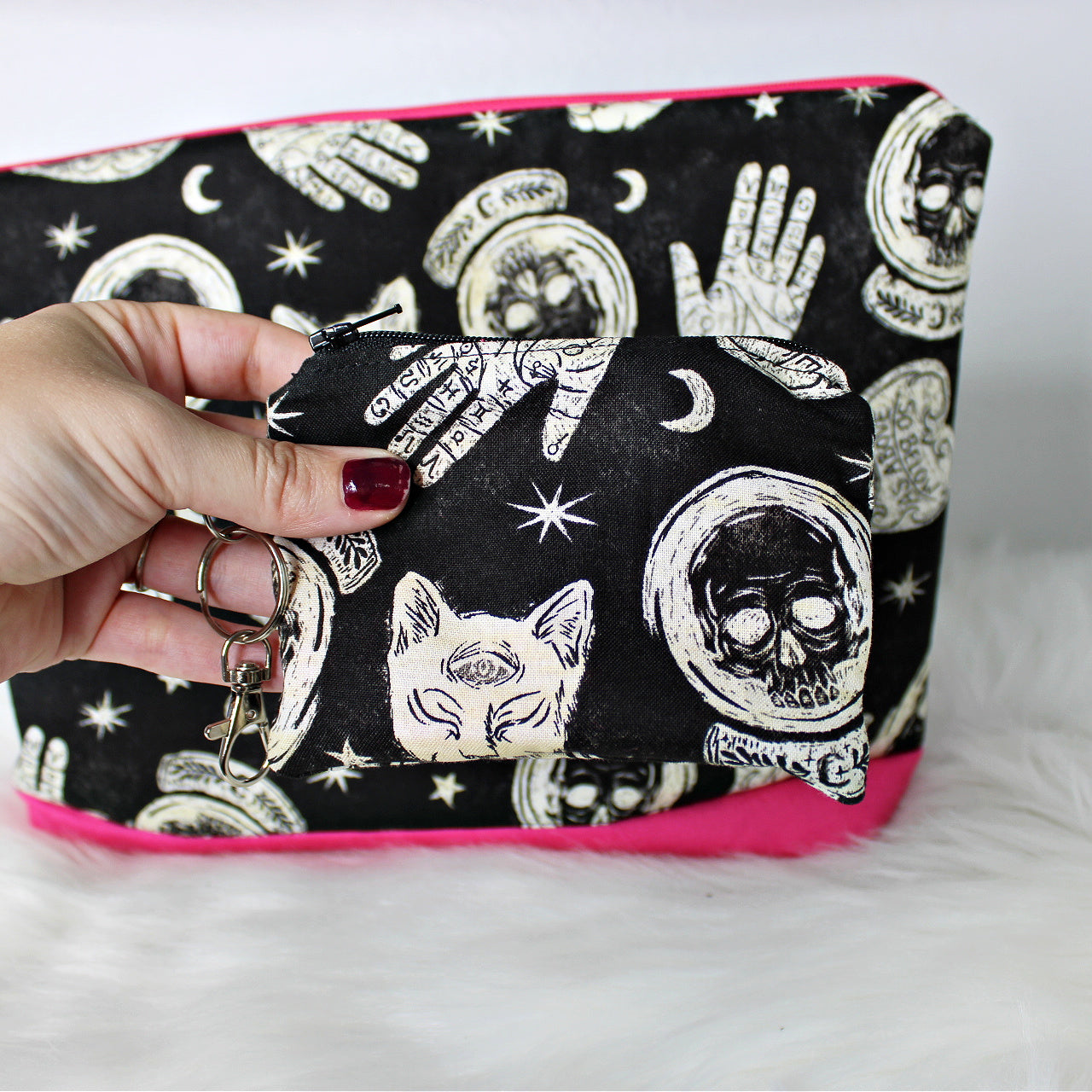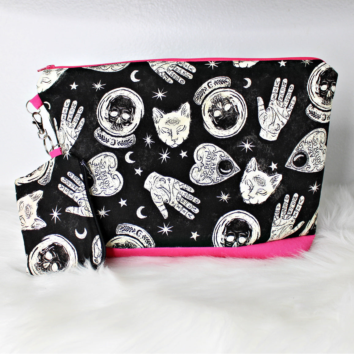 Elevate your beauty routine with our enchanting handmade makeup storage bag, crafted for the modern mystic. This spacious bag features a striking black and hot pink color scheme, adorned with celestial and witchy designs. Perfect for organizing all your beauty essentials, its durable construction ensures your items are protected while adding a touch of mystical elegance to your vanity.